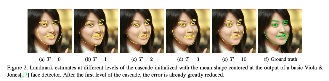 \[\pi_i \in \{1, ..., n\} \\\] \[\hat{S}_i^{(0)} \in \lbrace S_1, ..., S_n \rbrace \not S_{\pi_i}\\\] \[\Delta S_i^{(0)} = S_{\pi_i} - \hat{S}_i^{(0)}\]三元组的总数为 $N = nR$, $R$ 为用于每一张照片的初始化数量. 每一个初始化的形状预测器从${ S_1, …, S_n}$ 中均匀采样.